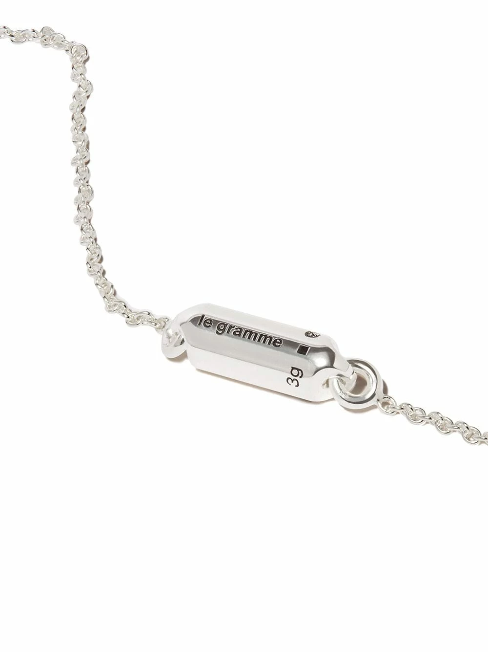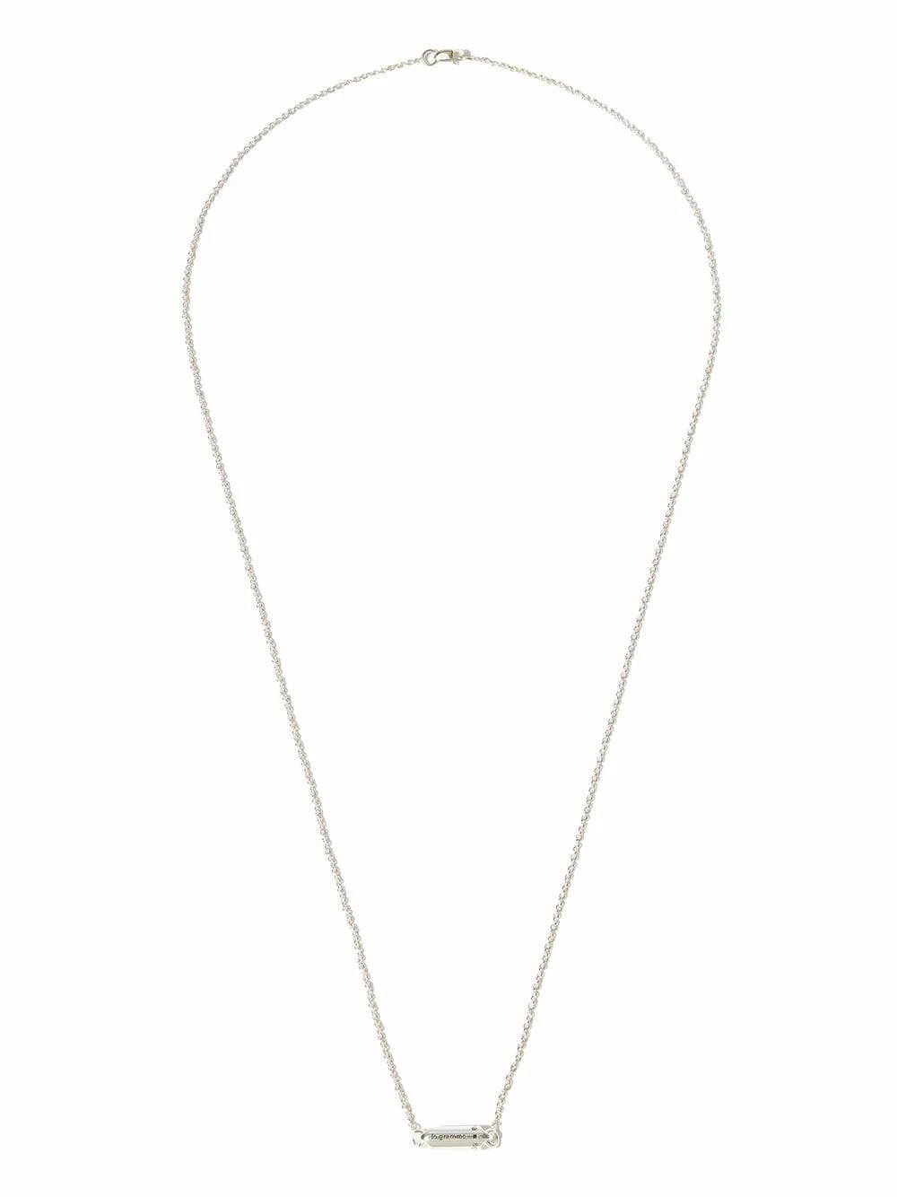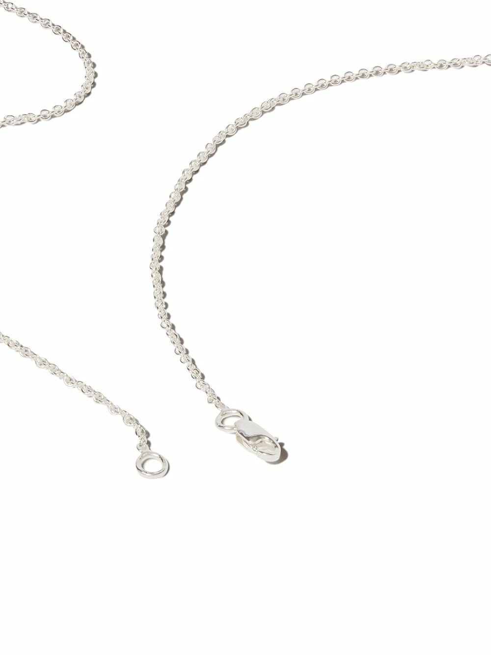 Fermoir mousqueton, chaîne fine, fini poli, logo gravé. Matière : argent sterling.