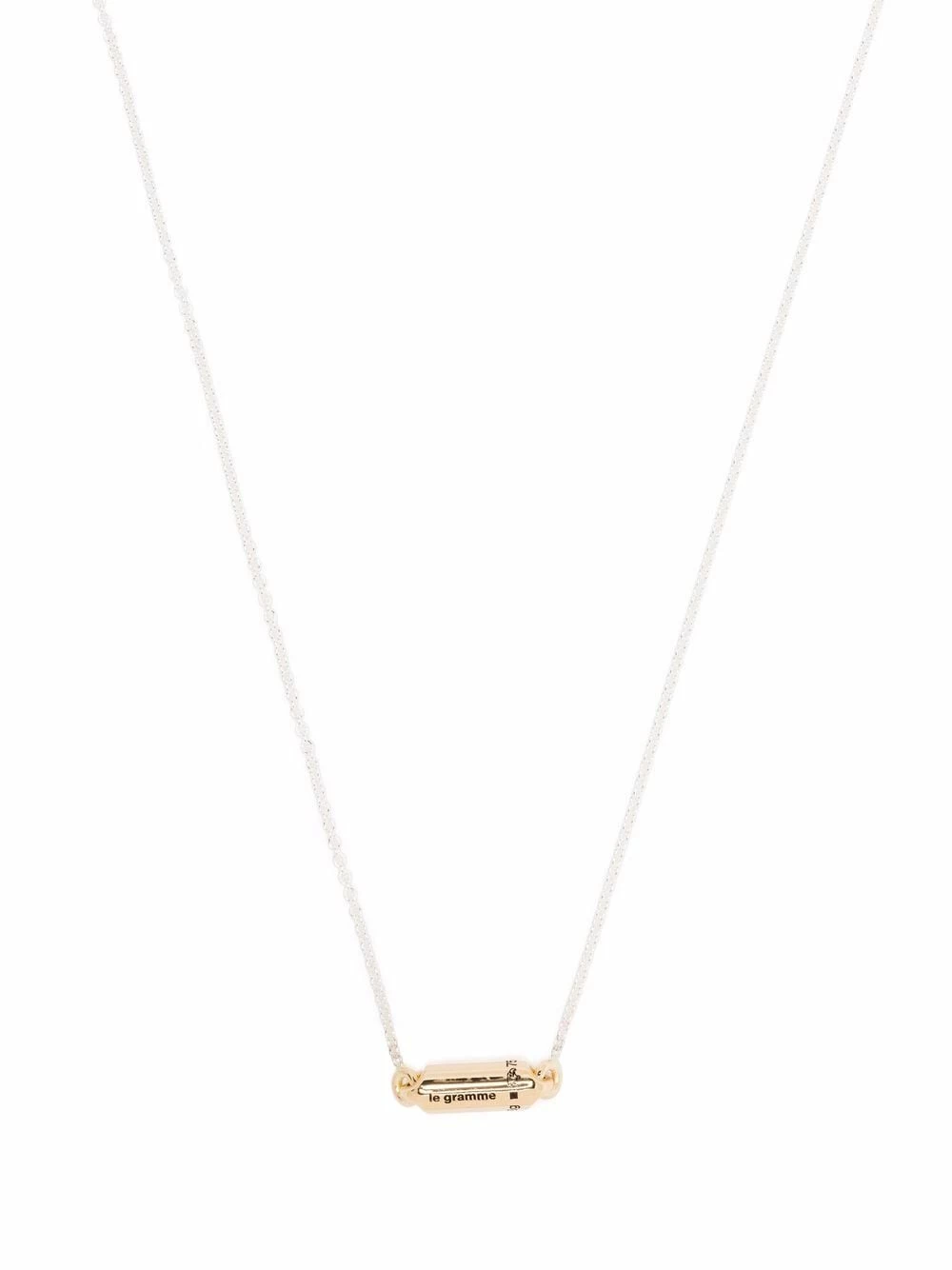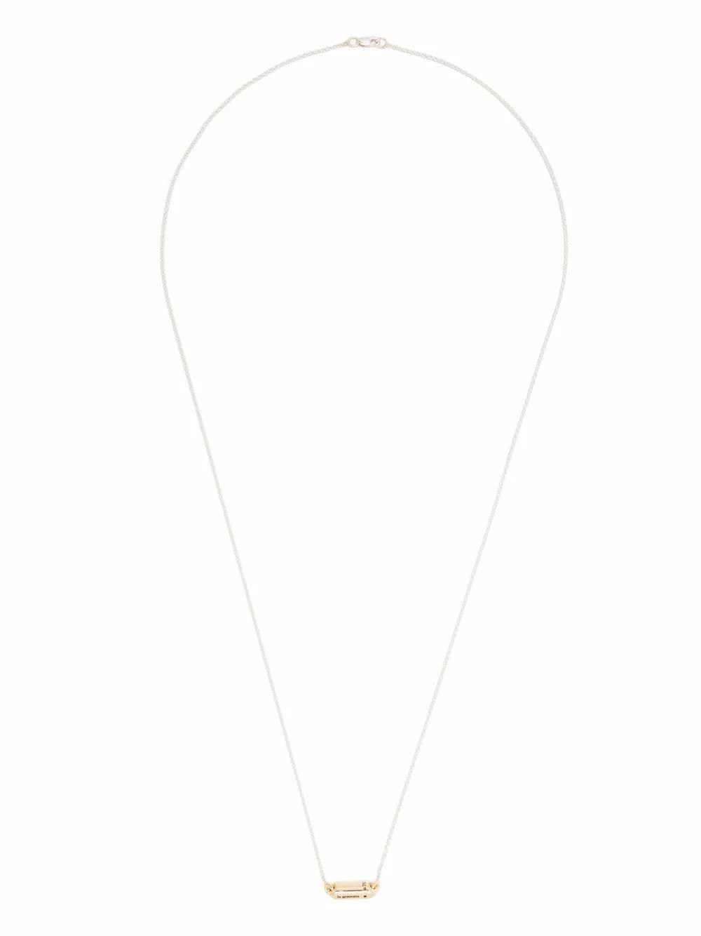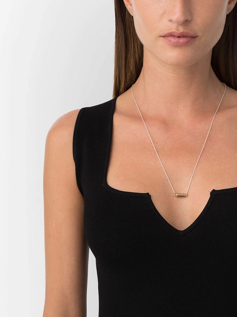 Fermoir mousqueton, chaîne fine, logo gravé, pendentif oversize, fini poli.